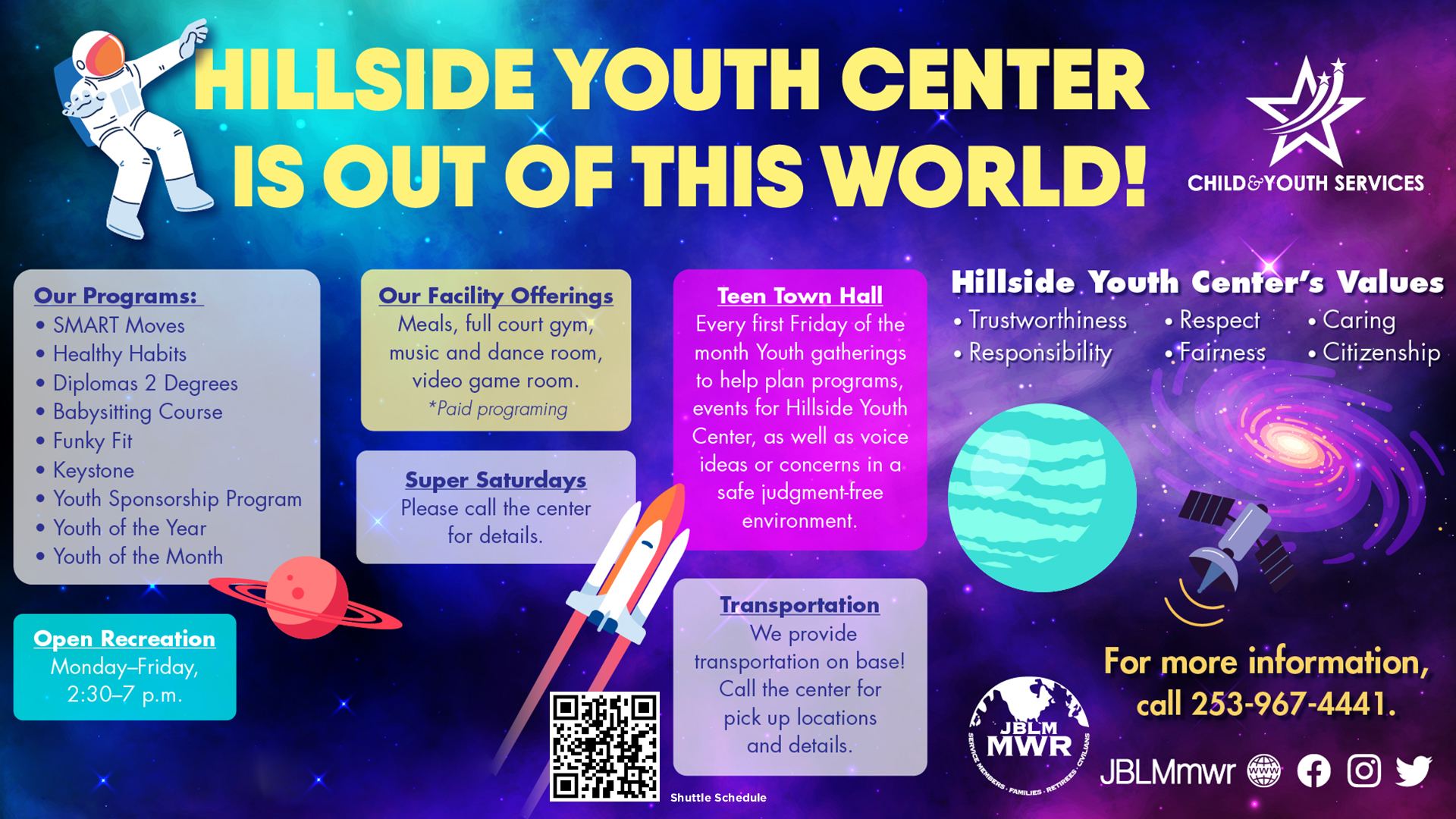 New to JBLM? Fill out the Youth Sponsorship Request Form and be paired up with a Youth Center regular who will help ease your transition into your new home and youth center. Email completed forms to Hillside Youth Center.