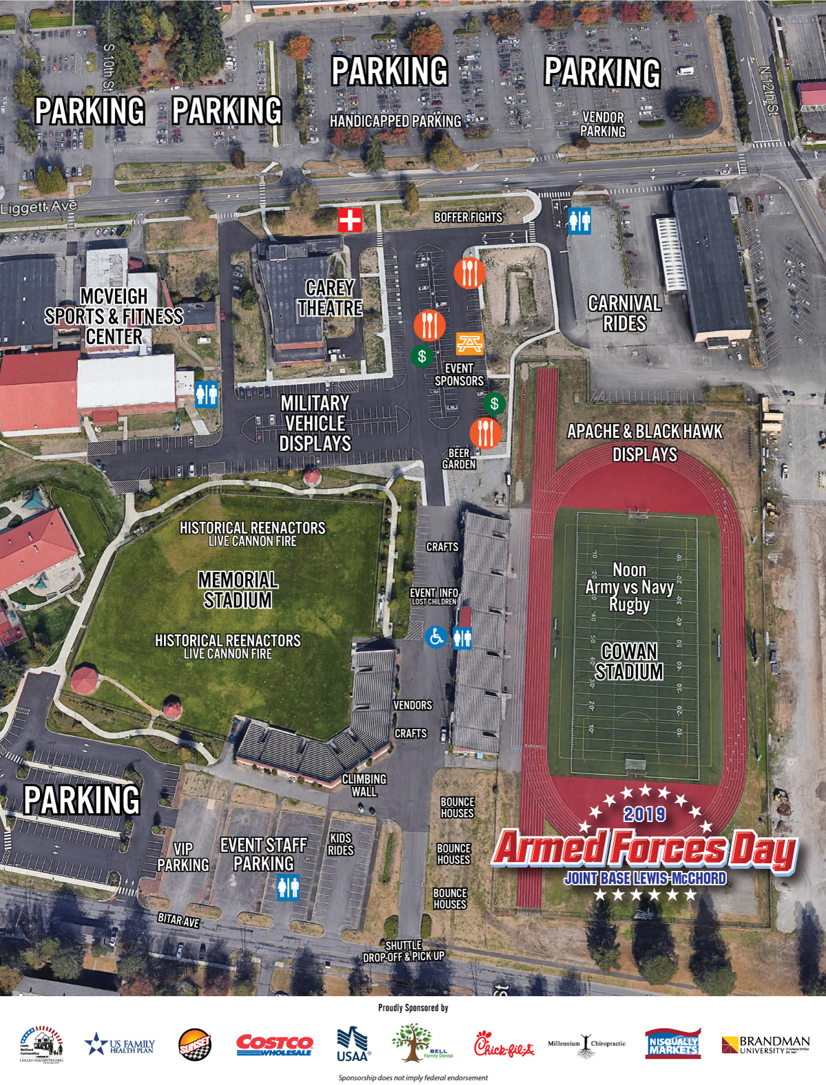 Admission, parking, military displays, historical reenactments, entertainment and athletic events are free. Carnival rides, food and other vendor products are available for purchase.