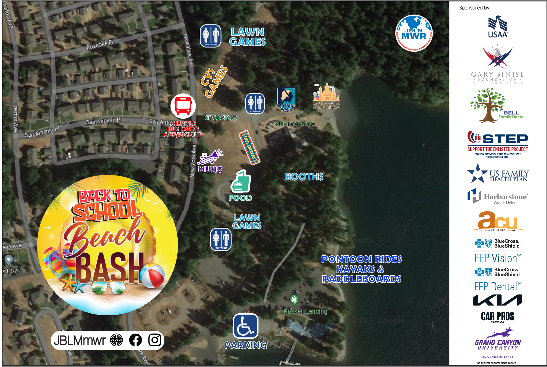 Outdoor games, sandcastle-building competition, rock wall climbing, water slides, crafts, back-to-school info, food trucks, live DJ and much more!
