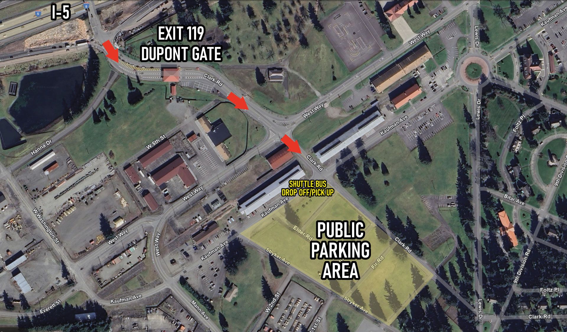 As of June 24, all non-DoD ID cardholders must use the DuPont Gate to access the event. Shuttle service will be available from the satellite parking area to the event. After enjoying the event, return to the bus drop-off point and catch the bus back to your vehicle.