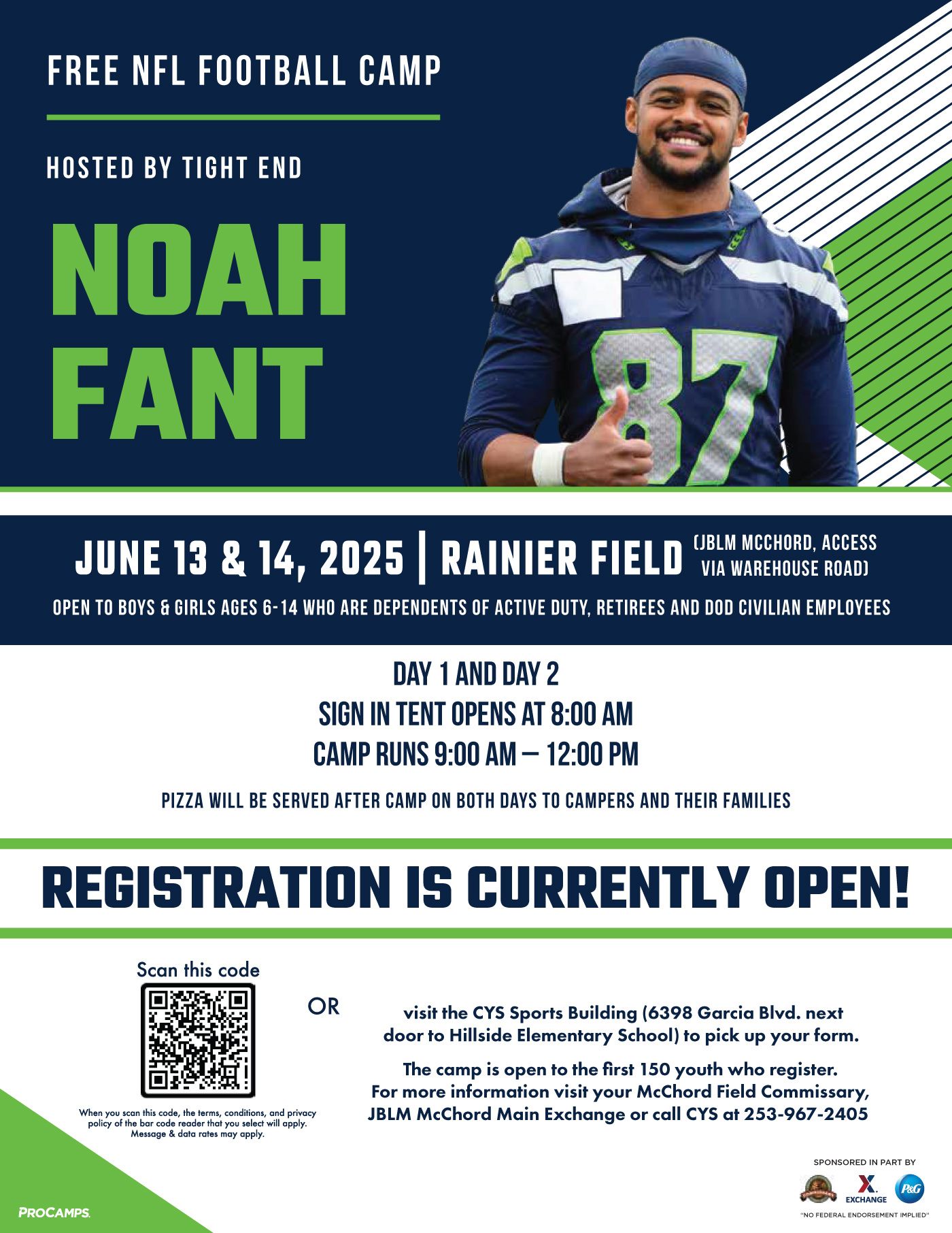 Open to boys and girls ages 6-14 who are dependents of active duty, retirees and DoD civilian employees. The camp is open to the first 300 youth to register (150/day). For more information, visit your McChord Field Commissary, McChord Field Main Exchange or call CYS at 253-967-2405.