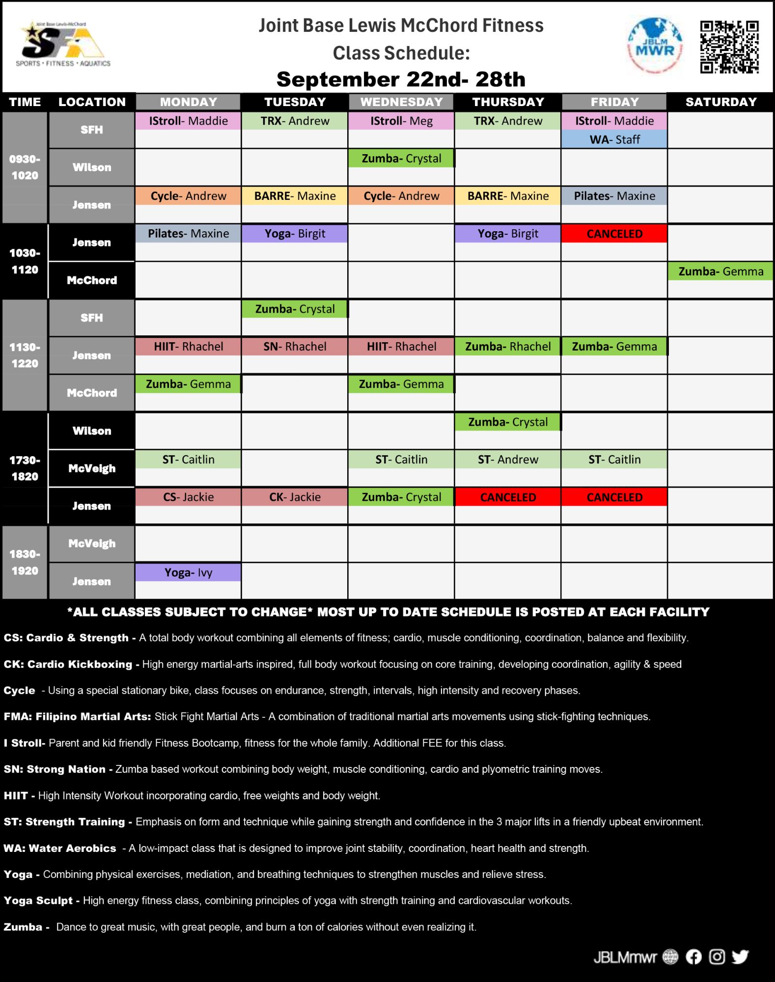 SEPT 22-28 FITNESS CLASS SCHEDULE