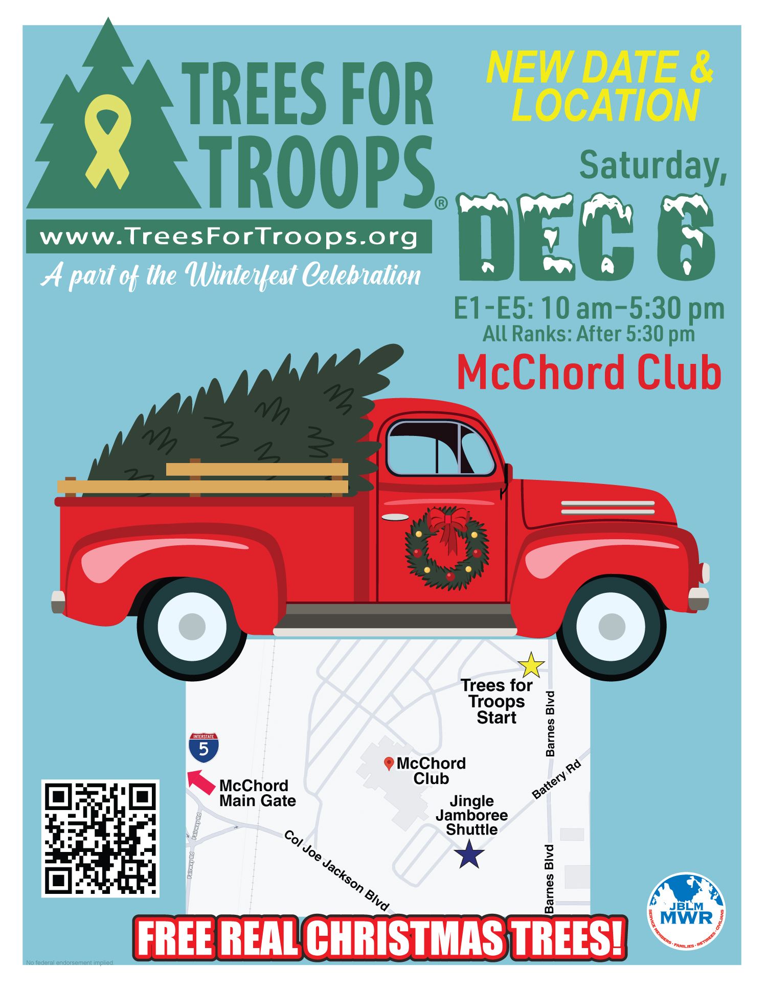 Active duty E1-E5, pick up a free real Christmas Tree while they last! 10 a.m.-5:30 p.m. If any trees remain after 5:30 p.m., they will become available to all ranks. The starting point is the McChord Club parking lot. Trees provided courtesy of the Christmas Spirit Foundation. Catch the shuttle to Jingle Jamboree from the McChord Club!